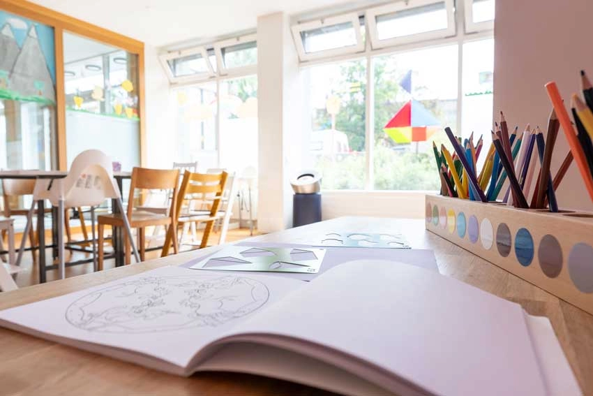 Im Atelier wird gemalt, geklebt, ausgeschnitten, geschrieben, gestaltet, gekleckst, gemischt, probiert und erschaffen. Bei all dem wird die Fantasie, Grob- und Feinmotorik, Kreativität, Fingerfertigkeit und Ausdauer gefördert. Ebenso werden die ersten Grundlagen für das Erlernen des Schreibens gelegt und der Sinn für Ästhetik gebildet.